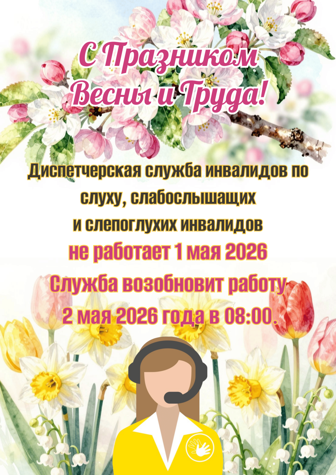 Диспетчерская служба инвалидов по слуху, слабослышащих и слепоглухих инвалидов работает ежедневно с 08:00 до 20:00, кроме государственных праздников, бесплатно.