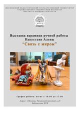 В Библиотеке Московского педагогического государственного университета (художественно-графический факультет) проходит выставка уникальной керамики "Связь с миром". На выставке представлены работы, выполненные в мастерской Семейного центра нашей бывшей воспитанницей (тотально слепоглухая) Алёной Капустьян под руководством учителя Колупаевой Анжелы Станиславовны. Алёна ослепла и оглохла в 3 года. С окружающим миром она взаимодействует тактильно, используя дактилологию в общении. Сейчас Алёна студентка колледжа РГСУ, успешна и реализована в жизни.