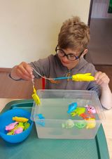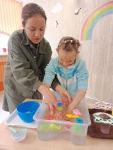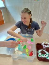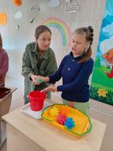 За окном непогода: грозы и дожди, а у нас сегодня игры и упражнения с водой. Целью которых является: учить детей манипулировать игровыми предметами в воде. Дать представление о том, что водой можно не только умываться и опускать в неё руки, но и получать знания и море удовольствия. Подъём, переливание, переноска и сжимание помогают развивать мелкие мышцы рук, а также зрительную и двигательную координации. Водная арттерапия способствует снятию психического напряжения, агрессии, создаёт радостное настроение и массу приятных впечатлений.