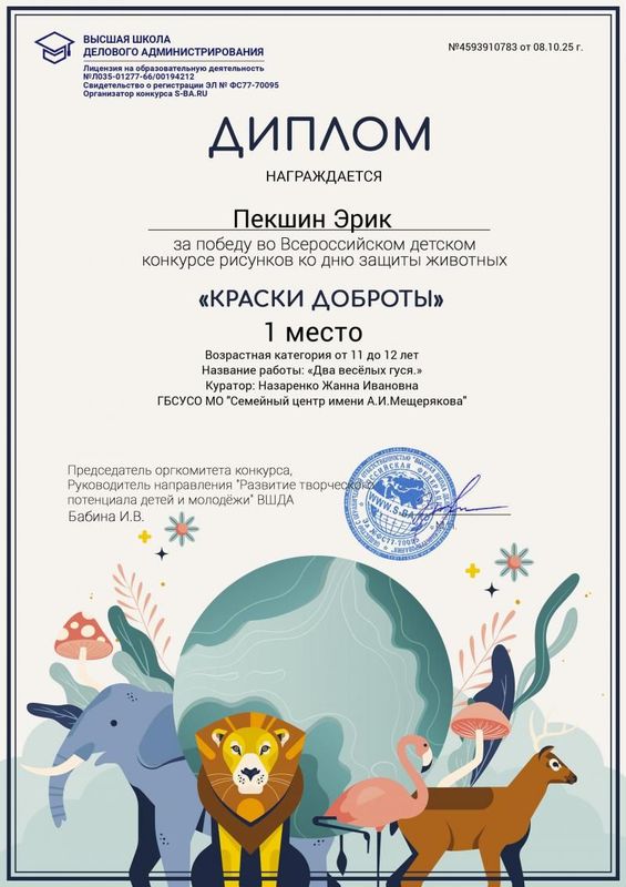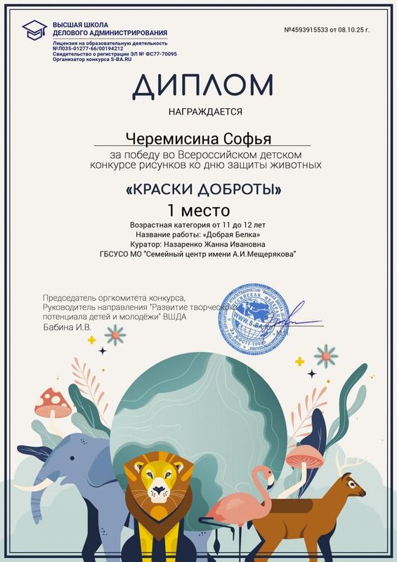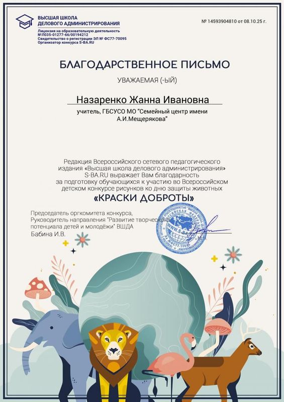 Воспитанники Семейного центра имени А.И. Мещерякова приняли участие и стали победителями во Всероссийском детском творческом конкурсе рисунков ко дню защиты животных «Краски доброты». Животные помогают детям познавать мир и становится добрее. Ребята осмотрели макеты и фигуры животных с последовательным выделением изобразительных признаков, частей и свойств предмета.