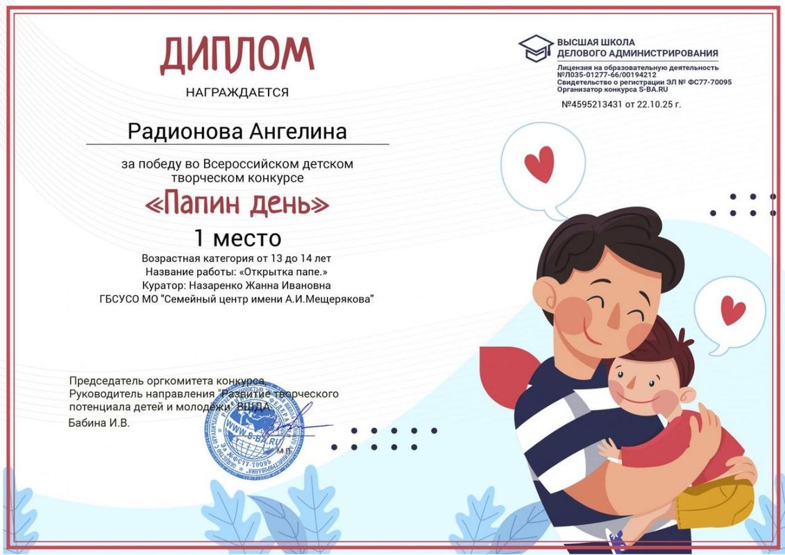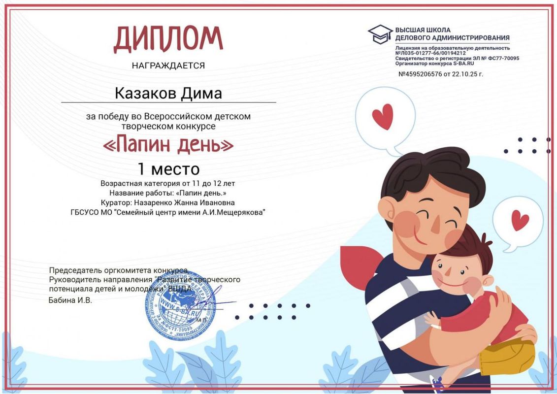Воспитанники Семейного центра имени А.И.Мещерякова приняли участие и стали победителями во Всероссийском детском творческом конкурсе «Папин день»
