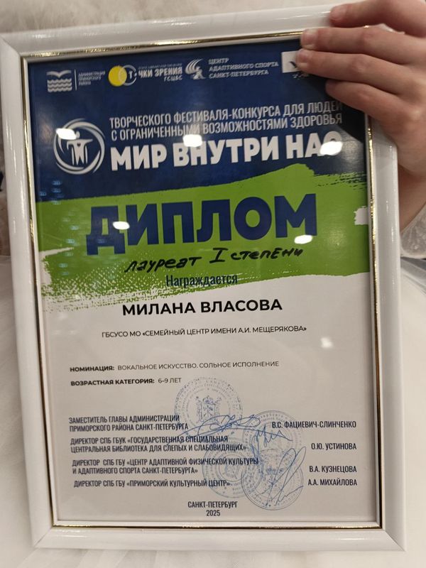 Сегодня мы с огромной радостью и гордостью делимся новостью: воспитанница Семейного центра Власова Милана одержала блестящую победу в творческом конкурсе детей с ОВЗ, который прошел в Санкт-Петербурге. Милана участвовала в номинации "вокал". Поздравляем Милану Желаем ей дальнейших успехов, неиссякаемого вдохновения и ярких побед!