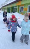 А завершилась эта веселая прогулка дружным паровозиком из санок, который проехал по всему снежному маршруту.