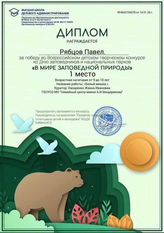 Воспитанники Семейного центра имени А.И. Мещерякова приняли участие и стали победителями Во Всероссийском детском творческом конкурсе ко Дню заповедников и национальных парков «В мире заповедной природы» Дети проявили творчество создавая аппликации и рисунки, посвященные этой важной теме.