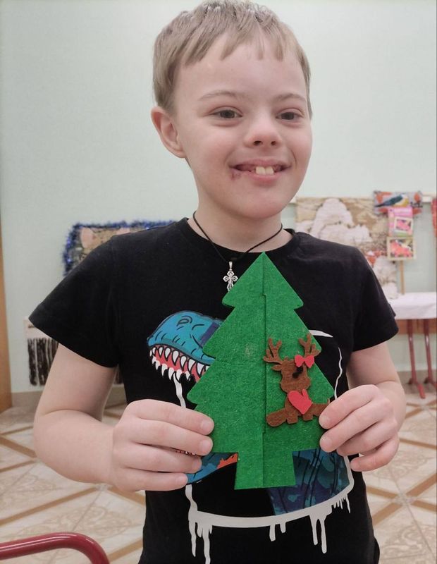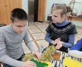 Ребята разных возрастов вместе соткали панно, а младшие участники украсили его новогодними игрушками и своими поделками