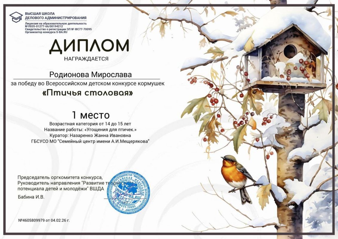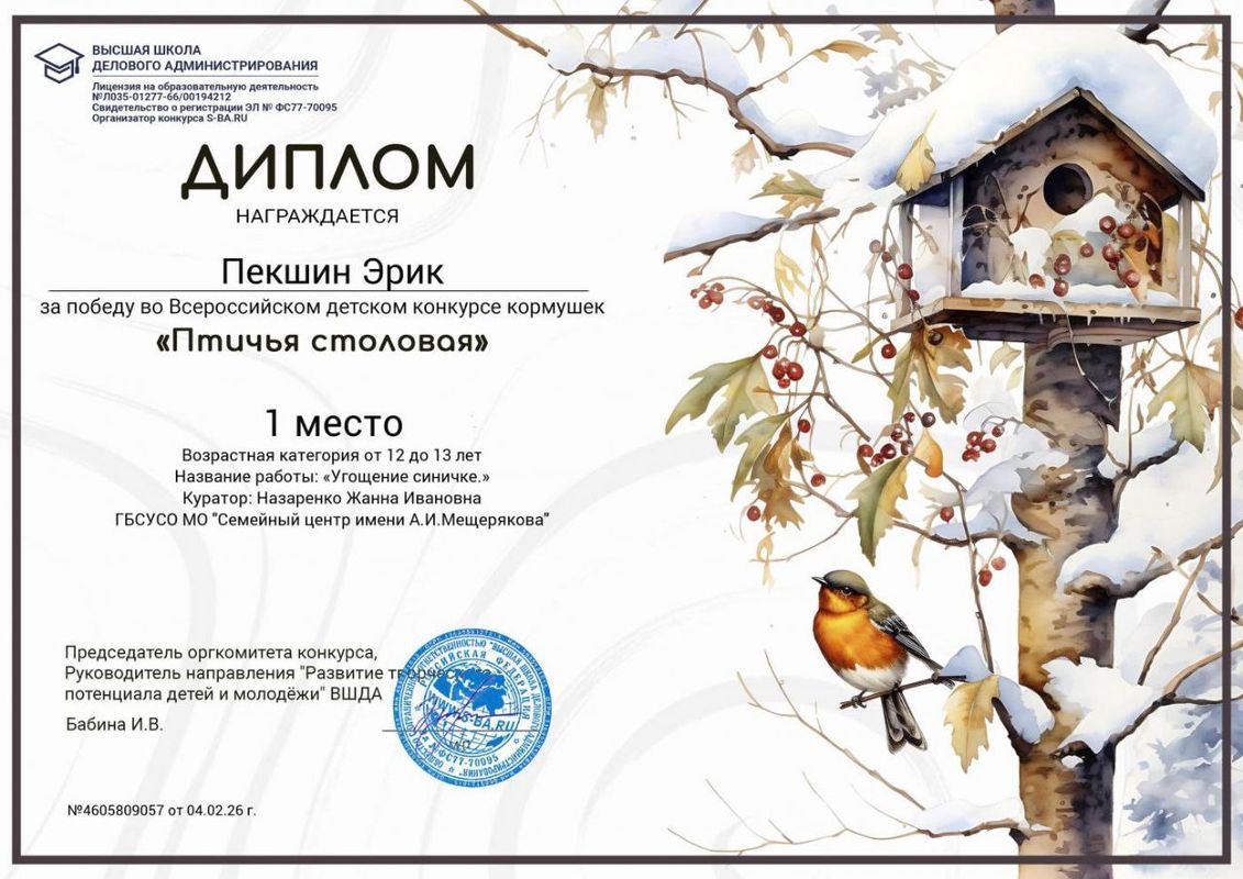 Воспитанники Семейного центра имени А.И. Мещерякова приняли участие и стали победителями Всероссийского детского конкурса кормушек «Птичья столовая». Всемирный день кормления птиц отмечается в феврале. Это экологический праздник, который призван привлечь внимание к тому, что птицам в зимний период, когда их запасы еды истощаются, необходима помощь людей принято подкармливать птиц, чтобы помочь им пережить холодное время в течение осенних и зимних месяцев ведется практическая деятельность,ребята создают новые кормушки,подсыпают семена и зерна. Это не просто участие в творческой деятельности это также.