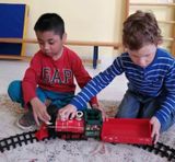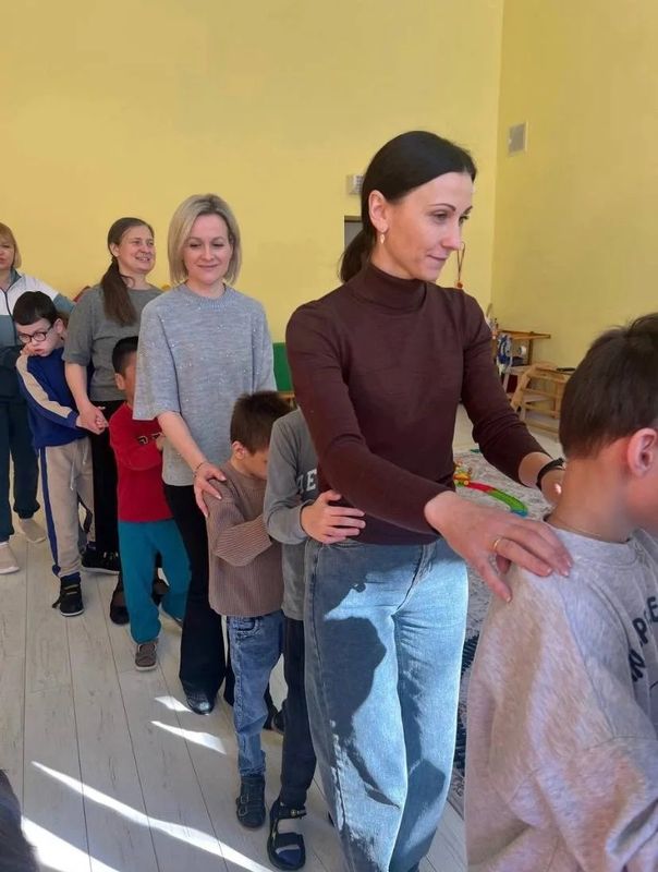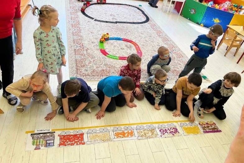 Но самым весёлым приключением стало превращение самих ребят в живой паровоз! Каждый стал вагончиком, крепко взялся за плечи впереди стоящего, и наш длинный-длинный дружный состав тронулся в путь! Все дружно двигались под весёлую песенку, повторяя все движения: «чух-чух», «ту-ту» и «пых-пых».